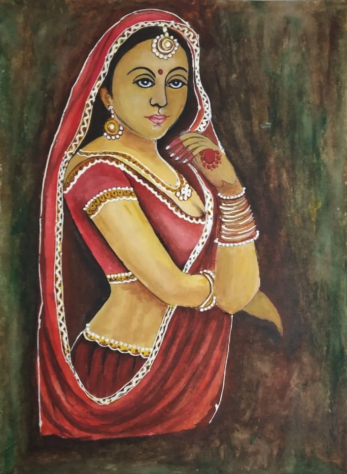 This is a handmade watercolor painting . The painting shows a beautiful Rajasthani lady. The painting is inspired by the traditional rajasthani Art form and reflects the heritage beauty of India.